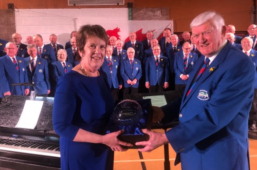 Ann Bufton, Builth Male Voice Choir’s accompanist for over 41 years performed in her final concert on Saturday 1 March at the annual St David’s Day Concert. At the end of the successful concert Bob Jones, one of the longest serving Choir members, presented Ann with a cut glass rose bowl to commemorate her years of dedication and service to the Choir.