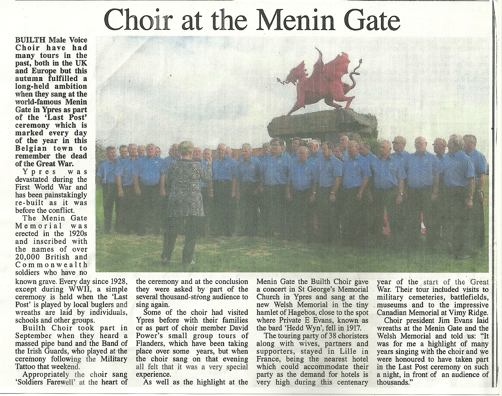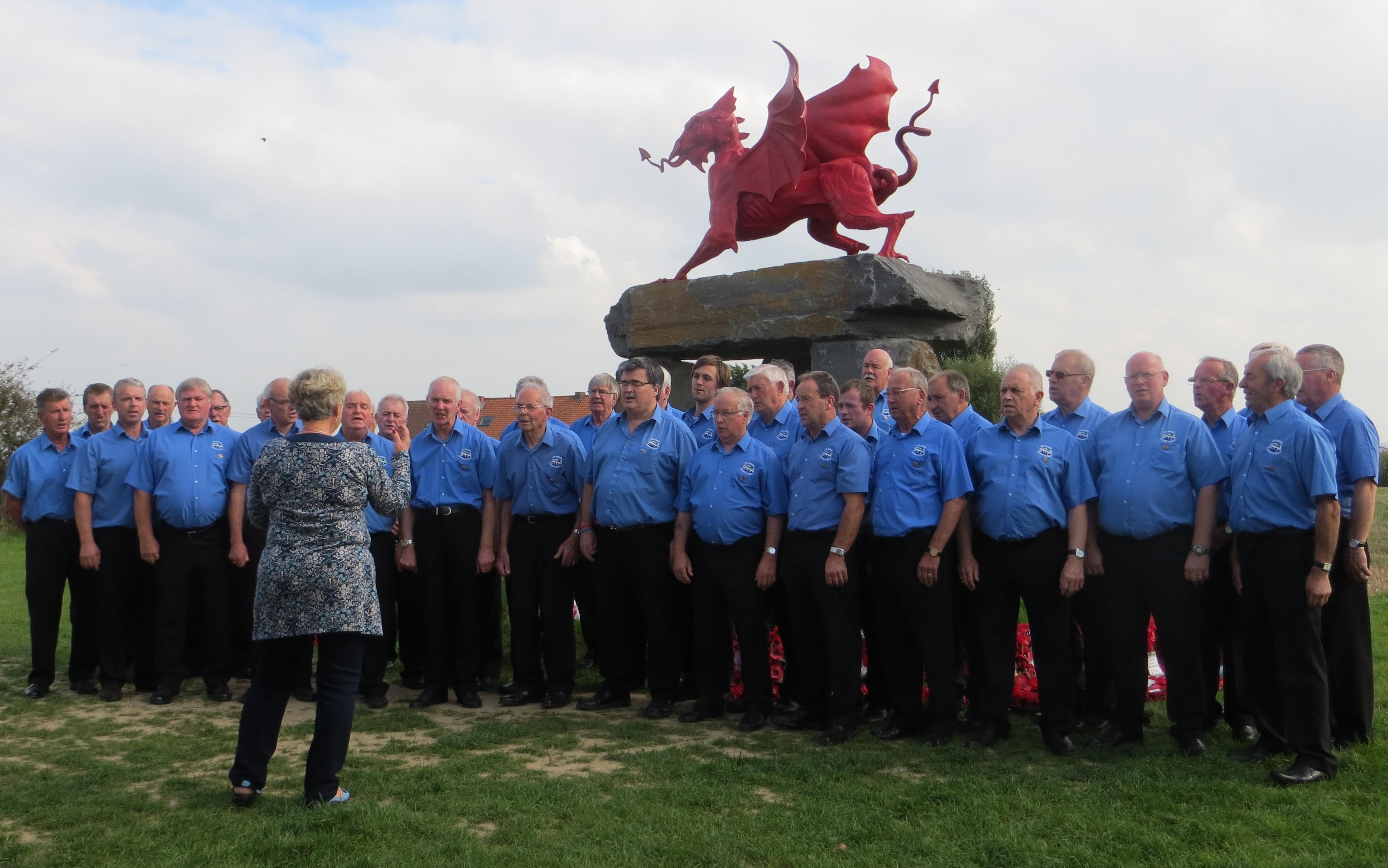 The choir also made pilgrimage to the new Welsh Memorial at Hagebos, north of Ypres and visited the memorial to Hedd Wynn nearby. As Private EH Evans of the Royal Welsh Fusiliers his death occurred in 1917 and he was famously awarded the Bardic Chair posthumously at the next National Eisteddfod.