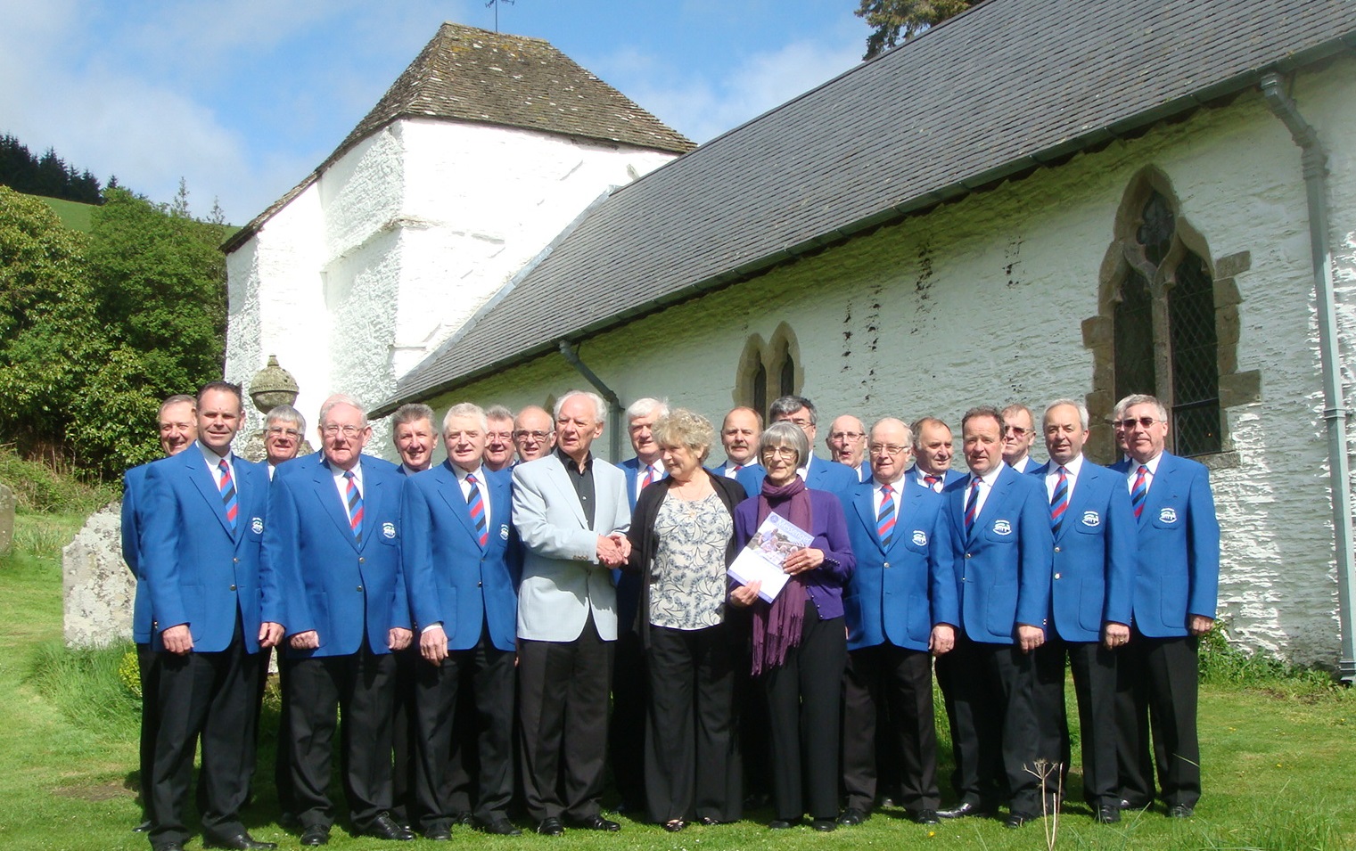 Allan and Angela welcomed by Choir members and Musical Director Luned Jones at St Mary’s Church Pilleth on the slopes of Bryn Glas Hill.