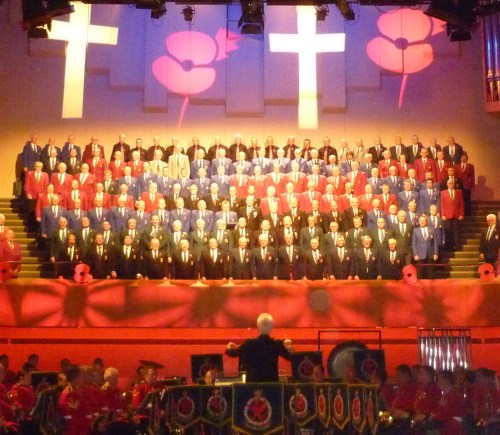 On Saturday the choir took part in the Wales Festival of Remembrance at St David’s Hall Cardiff. There was just about room for us, although it took a little while for them to allocate us our seats and we had one of the larger groups of singers. Members of the audience told us afterwards that a lovely sound was produced! We also had the distinction of sharing the stage with Des O’Connor. Although we didn’t actually sing with him, some of us felt we could definitely have added something to his Buddy Holly medley. We don’t know what Morecambe and Wise would have said! Those of you with good eyesight may be able to pick out our tenors in the photo above – they are in the 3rd and 4th rows from the front.
