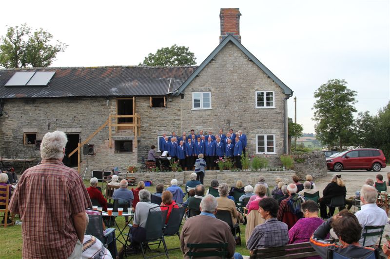 The choir was delighted to take part in this special event to celebrate the restoration of “Hymns Farm” which its new owner, Elizabeth Passey has been working on for the past few years. The farm which has beautiful views of the Radnor hills all around, was a focus for the growth of non-conformism in the area and the West Barn was the meeting place for worship. The Choir opened the evening by singing from the new terrace in the central courtyard of the farm and later moved into the restored barn to conclude the evening. The sound of singing once again filled the building as it had all those years ago, before a chapel was built for the congregation. In between the singing, Welsh authors gave readings from their works. Neil Griffiths began the readings and later, Horatio Clare and Sue Gee read excerpts from their work. Proceeds from donations and a raffle were shared between St Stephen’s Church at Old Radnor and the Wye and Usk Foundation.