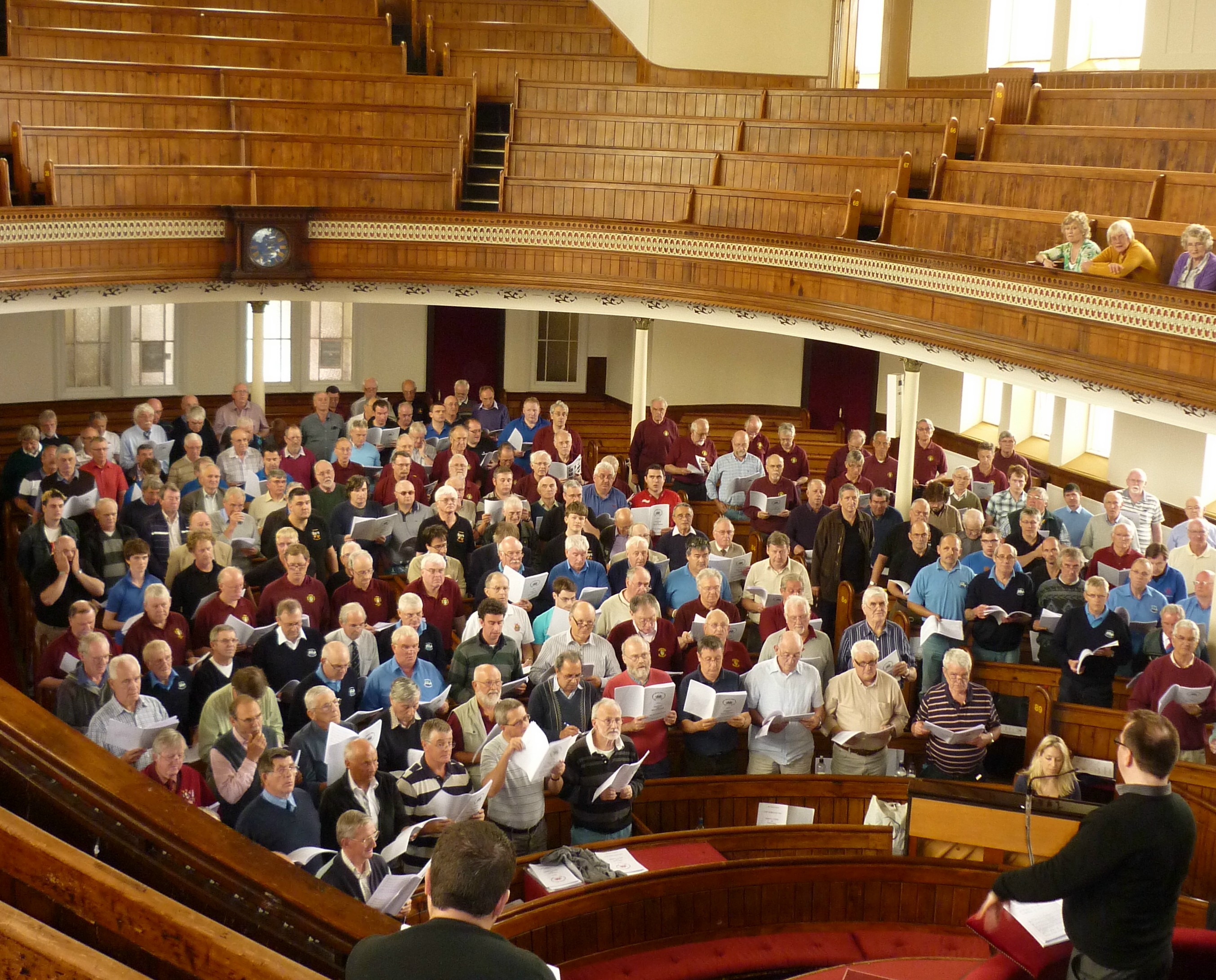 Edward Rhys-Harry conducting some of the massed choirs in the Tabernacle Chapel, Morriston, in preparation for October’s London Welsh MVC’s Festival of Massed Voices in the Royal Albert Hall. Builth boys are in blue with some fans in the gallery!