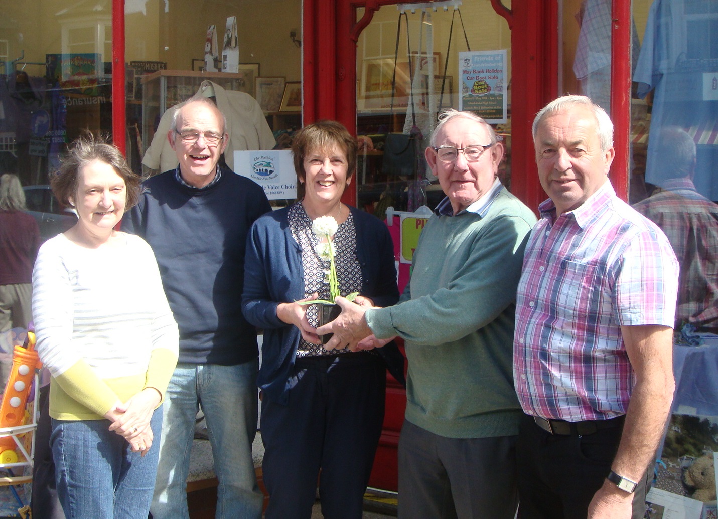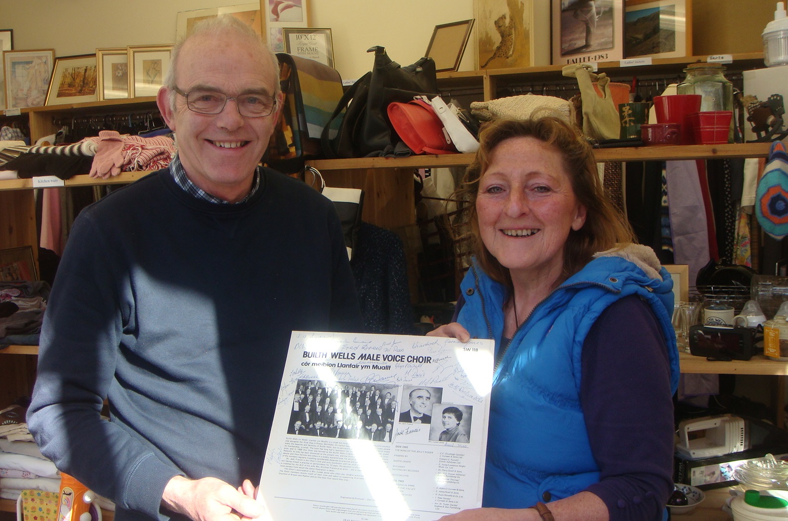 Builth Male Voice Choir held a very successful sale at Llandrindod Charity Shop from 16 – 23 April 2016 to raise funds to support the Choir. Chairman Viv Jones thanked everyone who had generously given goods for the sale and all the choir members and their partners who had helped to man the shop and make the week’s activity so successful. He gave particular thanks to Janys Rees from Llanyre who visited the shop and presented an LP recorded by the Choir in 1980 with a cover signed by most members from that time.