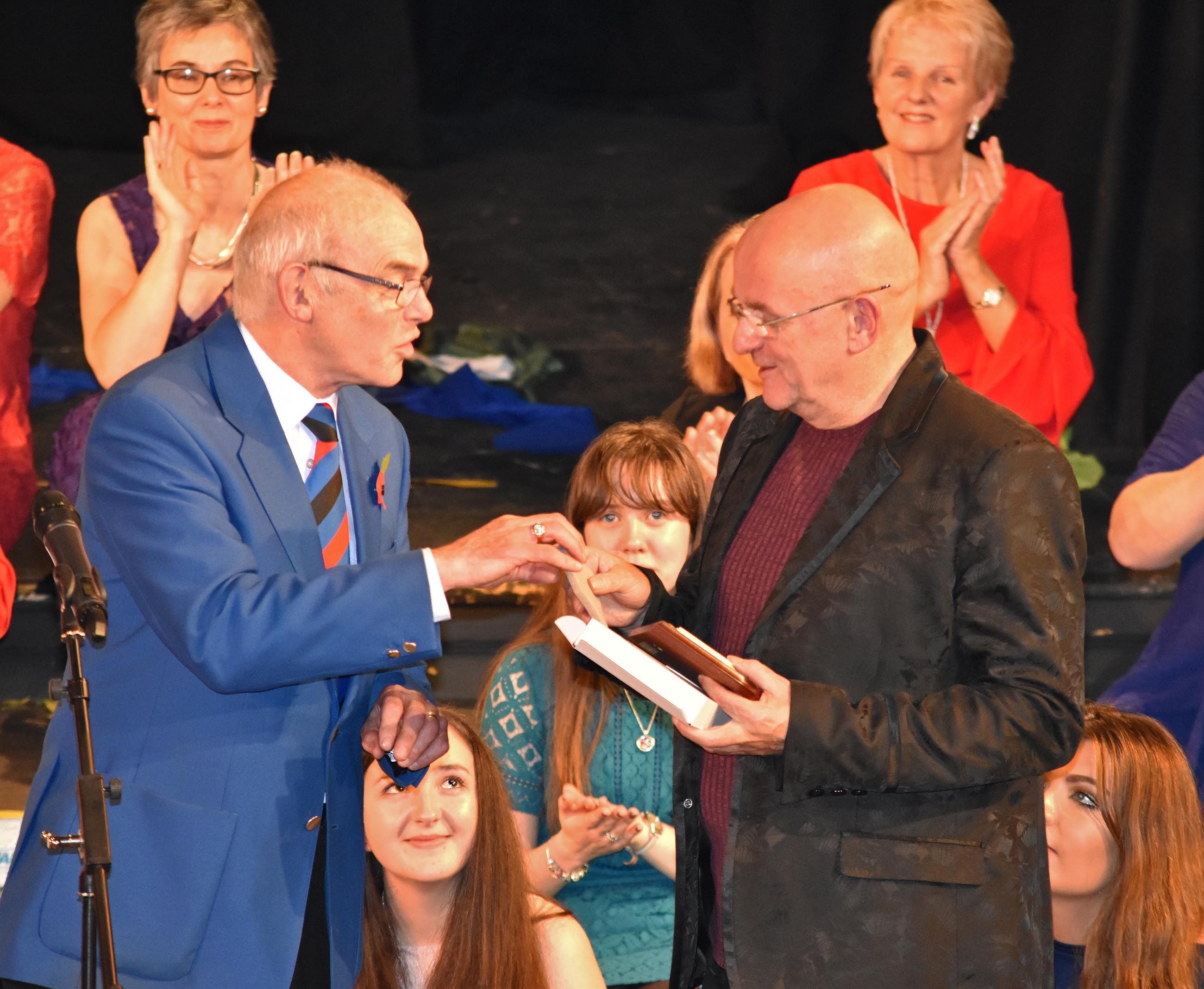 Viv Jones, BMVC Chairman, presenting a Choir plaque to Cefin Roberts, Musical Director Côr Glanaethwy